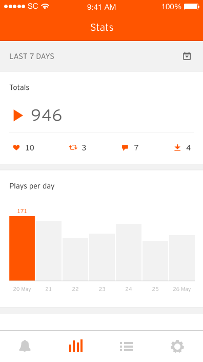 The moving interactive animation is an absolutely gorgeous and exciting feature, but it is unsuccessful when the plays vary so one’s thumb covers the number of the bar as they scroll, so that needs a slight tweak. The spacing in the categorized section isn’t consistent and again there is no type hierarchy. The desktop version has a grey section for tracks that are deleted that would provide useful for artist overall reach and cross-platform consistency.